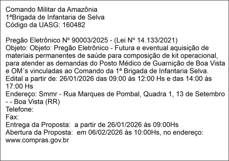 Comando Militar da Amazônia 1ªBrigada de Infantaria de Selva – Pregão Eletrônico Nº 90003/2025 janeiro 23, 2026 Nenhum comentário Leia mais »