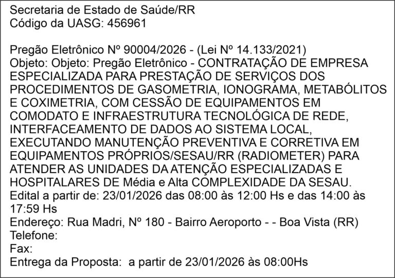 Secretaria de Estado de Saúde/RR – Pregão Eletrônico Nº 90004/2026 janeiro 23, 2026 Nenhum comentário Leia mais »