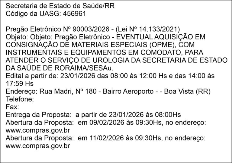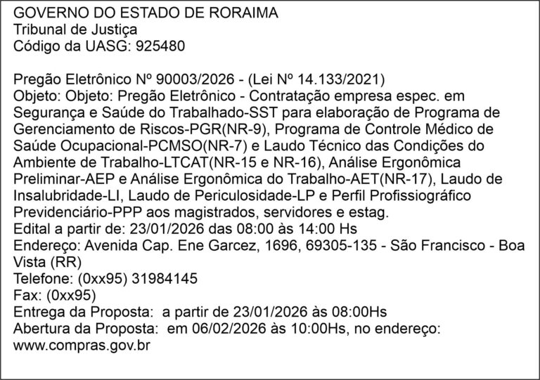 GOVERNO DO ESTADO DE RORAIMA Tribunal de Justiça – Pregão Eletrônico Nº 90003/2026 janeiro 23, 2026 Nenhum comentário Leia mais »