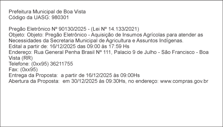 Prefeitura Municipal de Boa Vista – Pregão Eletrônico Nº 90130/2025 dezembro 16, 2025 Nenhum comentário Leia mais »