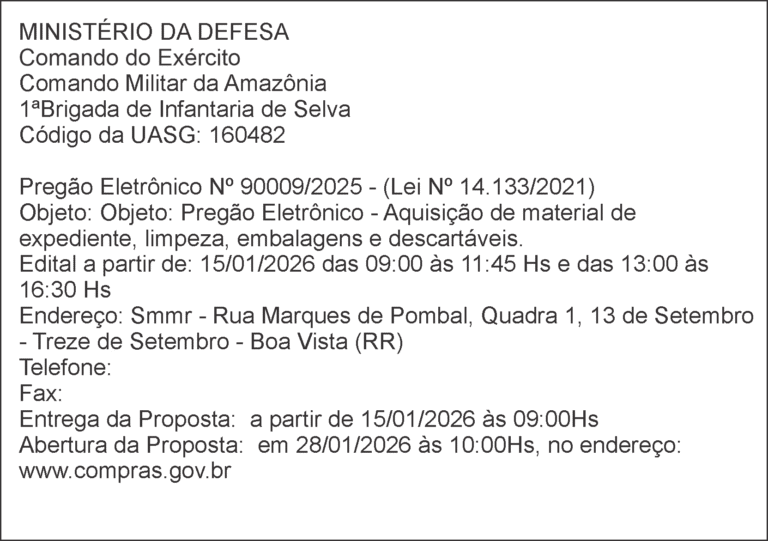 Comando Militar da Amazônia 1ªBrigada de Infantaria de Selva – Pregão Eletrônico Nº 90009/2025 janeiro 15, 2026 Nenhum comentário Leia mais »