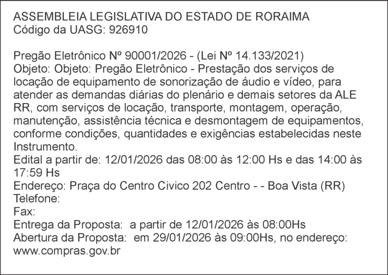 Assembleia Legislativa do Estado de Roraima – Pregão Eletrônico nº. 90001/2026 janeiro 12, 2026 Nenhum comentário Leia mais »
