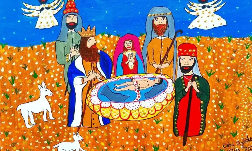 Outra homenagem a presépios em 2025 nasceu da inspiração da artista carioca Cora Azedo. Em cores vibrantes, e com anjos negros, ela produziu a obra em acrílico sobre tela (foto em destaque).