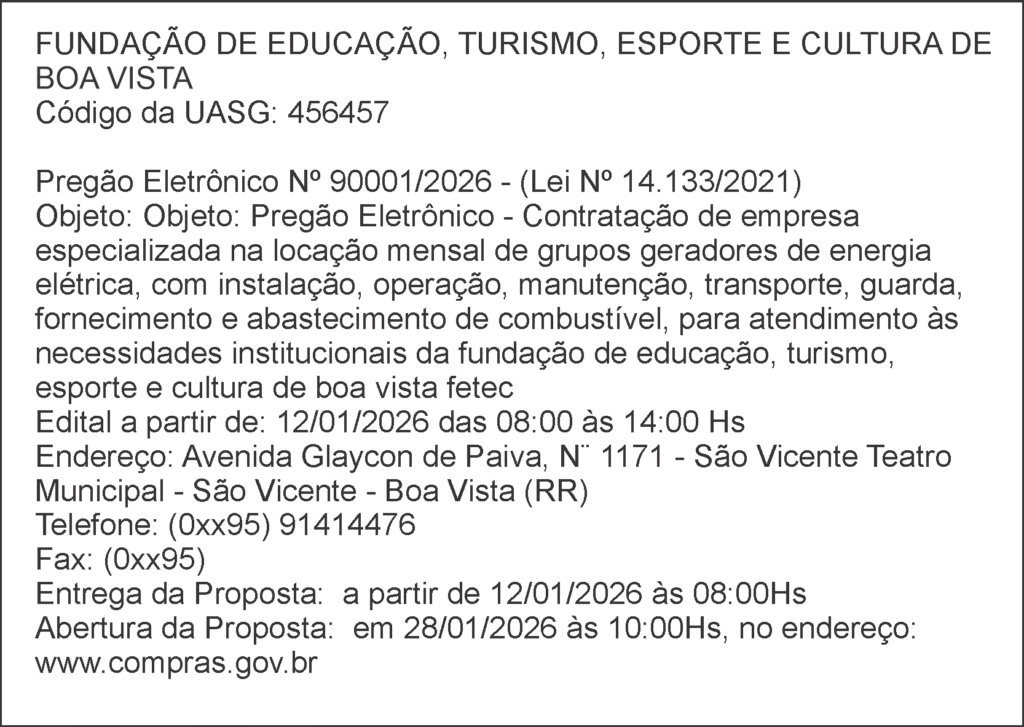 FUNDAÇÃO DE EDUCAÇÃO, TURISMO, ESPORTE E CULTURA DE BOA VISTA Código da UASG: 456457 Pregão Eletrônico Nº 90001/2026