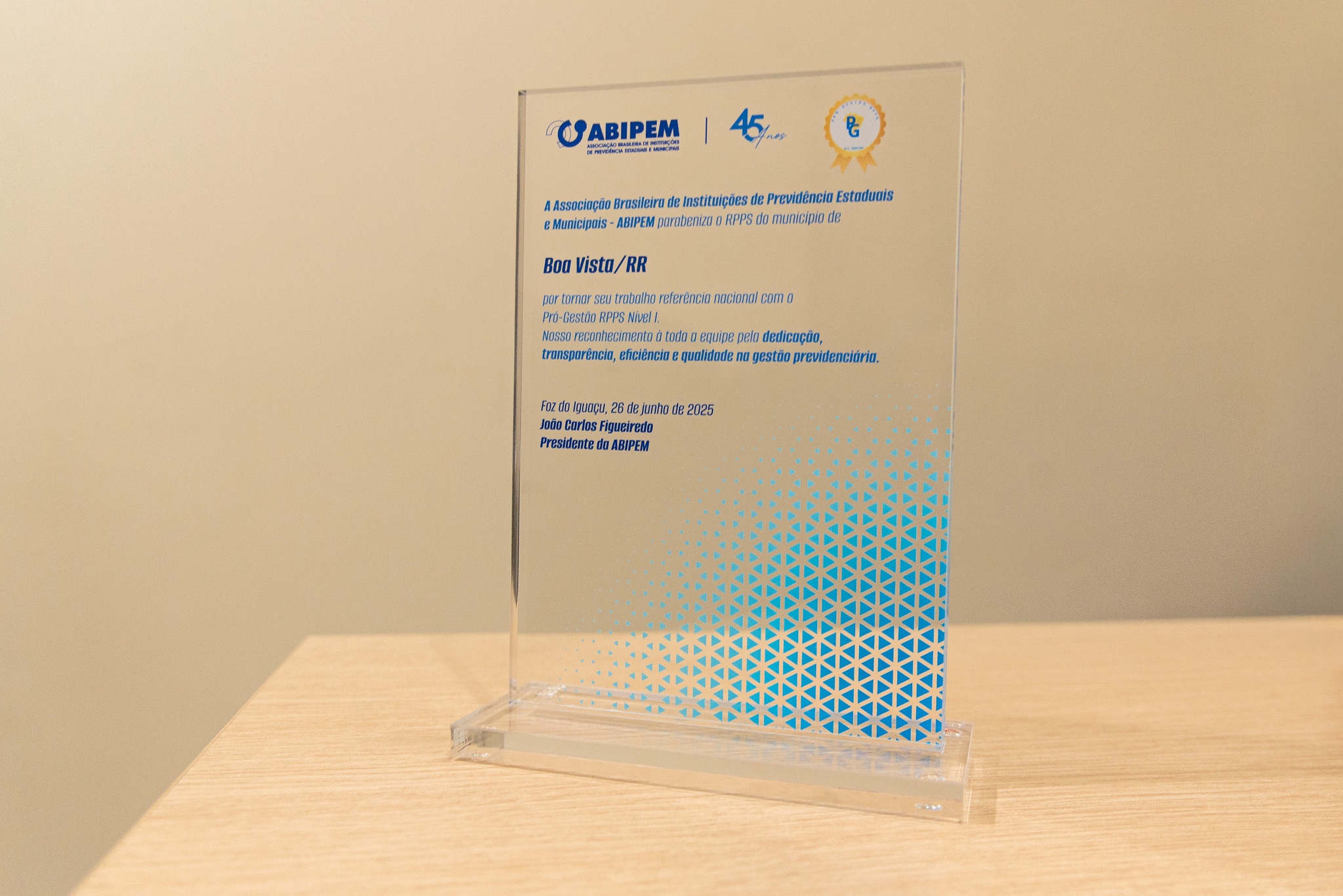 Boa Vista voltou a ser destaque no cenário nacional pela qualidade da sua gestão previdenciária. Durante o 13º Congresso Brasileiro de Conselheiros de RPPS, promovido nos dias 12 e 13 de dezembro, representantes do município receberam um troféu de reconhecimento da Associação Brasileira de Instituições de Previdência Estaduais e Municipais, que evidenciou o trabalho desenvolvido pelo Regime de Previdência Social dos Servidores Públicos do Município de Boa Vista (Pressem), referência nacional no Pró-Gestão RPPS – Nível I.